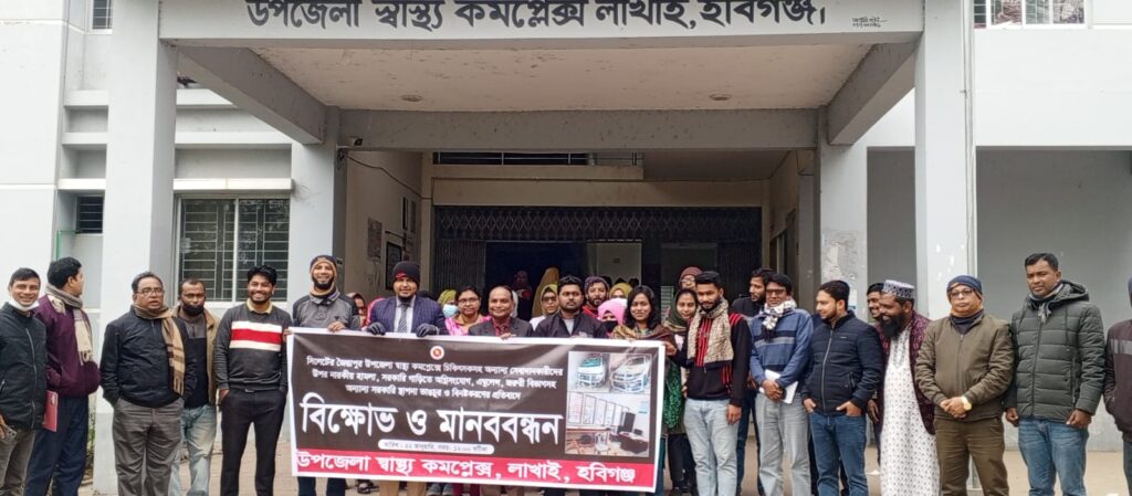 এম এ ওয়াহেদ লাখাইঃ সিলেট জৈন্তাপুর উপজেলা স্বাস্থ্য কমপ্লেক্সে চিকিৎসক, সেবাদানকারীদের উপর হামলা, সরকারী গাড়িতে অগ্নিসংযোগ, এম্বুলেন্স, জরুরী বিভাগ সহ সরকারী স্থাপনায় ভাঙচুর ও বিনষ্ট করণের প্রতিবাদে লাখাই উপজেলা স্বাস্থ্য কেন্দ্রে এক বিক্ষোভ ও মানববন্ধন কর্মসূচি পালন করেছে। সোমবার (২২ জানুয়ারি) দুপুর ১টায় উপজেলা স্বাস্থ্য কমপ্লেক্স প্রাঙ্গনে উপজেলা স্বাস্থ্য ও পঃপঃ কর্মকর্তা ডা.কাজী শামসুল আরেফীন এর নেতৃত্বে এক বিক্ষোভ ও মানববন্ধন কর্মসূচি পালন করেছে করা হয়েছে। বিক্ষোভ ও মানববন্ধনে অংশ নিয়েছেন ডাক্তার একেএম মঞ্জুরুল আহসান, ডাক্তার অপর্না সুত্রধর, ডাক্তার অনন্যা রায়,ডাক্তার সানজিদা শিশির সহ উপজেলা স্বাস্থ্য কমপ্লেক্সে এর কর্মকর্তা কর্মচারী ও নার্স বৃন্দ প্রমুখ। সিলেট জৈন্তাপুর উপজেলা স্বাস্থ্য কমপ্লেক্সে হামলা, ভাঙচুর ও অগ্নিসংযোগকারীদের শাস্তির দাবি জানান এবং হামলাকারীদের চিহ্নিত করে আইনের আওতায় এনে দৃষ্টান্ত মূলক শাস্তির দাবী জানিয়েছেন।