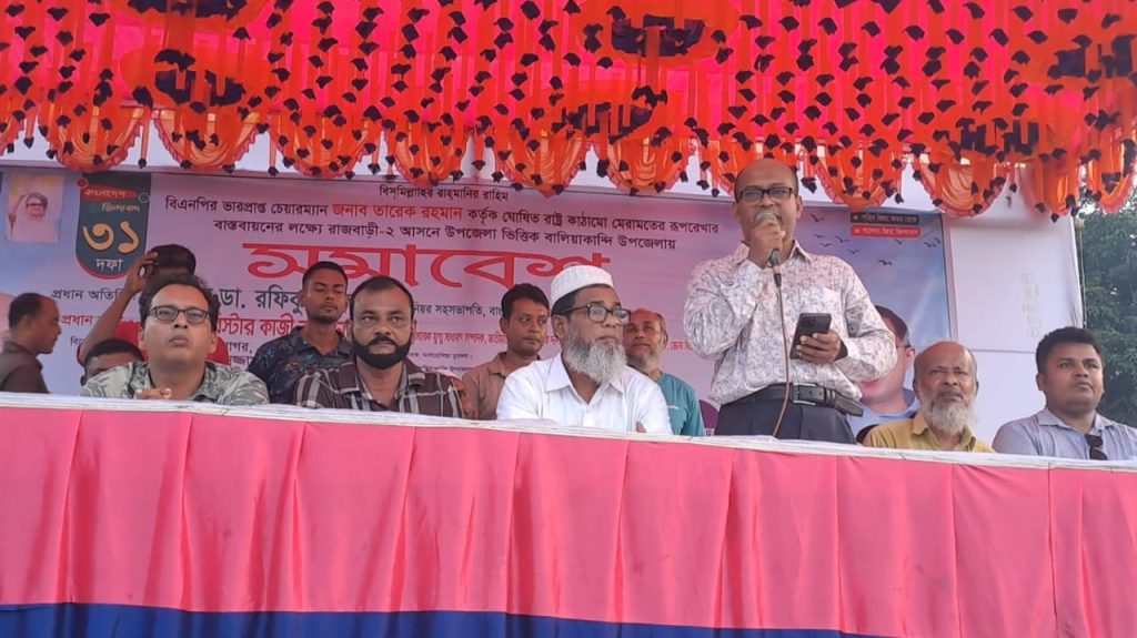 বিএনপির ভারপ্রাপ্ত চেয়ারম্যান তারেক রহমান ঘোষিত ৩১ দফা রাষ্ট্র কাঠামো সংস্কার ও পুনর্গঠনের কর্মসূচির অংশ হিসেবে রাজবাড়ী-২ আসনের বালিয়াকান্দিতে এক জনসমাবেশ অনুষ্ঠিত হয়েছে।