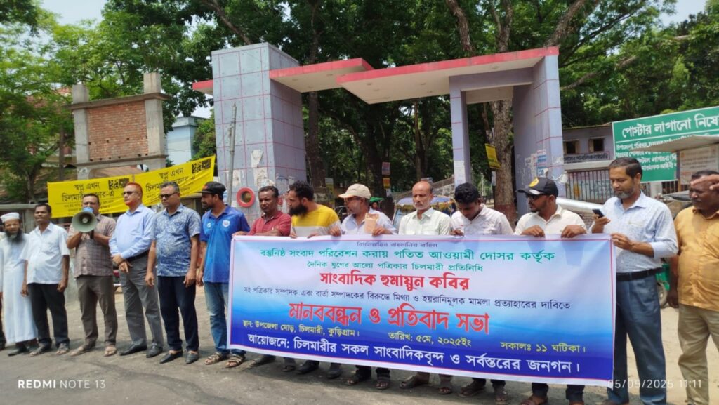 দৈনিক যুগের আলো পত্রিকার চিলমারী প্রতিনিধি , সম্পাদক ও বার্তা সম্পাদকের বিরুদ্ধে মিথ্যা, হয়রানিমূলক মামলা প্রত্যাহারের দাবিতে গতকাল সোমবার উপজেলা মোড়ে মানববন্ধন শেষে উপজেলা নির্বাহী অফিসারের নিকট স্বরাষ্ট্র উপদেষ্টা বরাবর স্মারকলিপি প্রদান করেছেন সাংবাদিক, রাজনৈতিক নেতাকর্মীসহ এলাকাবাসী।