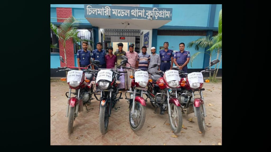 এরই ধারাবাহিকতায় অদ্য ২৭ তারিখ গভীর রাতে চিলমারী থানার বাজার এলাকায় একজন ব্যক্তিকে রহস্যজনক ভাবে ঘোরাফেরা করতে দেখে চোর চক্রের সদস্য সন্দেহে তাকে জিজ্ঞাসাবাদ করে চিলমারী থানা পুলিশের একটি চৌকস টিম। জিজ্ঞাসাবাদের এক পর্যায়ে সে একজন মোটরসাইকেল চোর চক্রের সদস্য হিসেবে স্বীকার করেন এবং তার তথ্যের ভিত্তিতে চিলমারী থানা এলাকার বিভিম্ন স্থানে রাতভর অভিযান পরিচালনা করে ৫ টি চোরাই মোটরসাইকেল উদ্ধারসহ চোর চক্রের সক্রিয় সদস্য মোঃ মিলন (২৬), মোঃ হান্নান মিয়া (৩২), মোঃ সাদাকাত হোসেন (৩৫), মোঃ নুরুল হুদা (৩৫) সাং-গাজীর পাড়া, সর্ব থানা-চিলমারী, জেলা-কুড়িগ্রাম ও মোঃ রুবেল মিয়া (২৭) সাং-হক বাজার নয়াটারী, থানা-হারাগাজ রংপুর মেট্রো, জেলা-রংপুর সহ ৫ জনকে হাতেনাতে গ্রেফতার করে চিলমারী থানা পুলিশের একটি চৌকস টিম।
