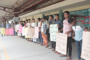 বগুড়ায় রেলের দূরত্ব ভিত্তিক রেয়াত বাতিলের প্রতিবাদে মানববন্ধন