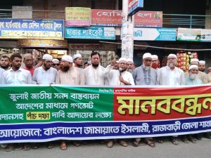 মোঃ আমিরুল হক, রাজবাড়ী প্রতিনিধি: জাতীয় জুলাই সনদ, পিআর পদ্ধতিতে নির্বাচনসহ পাঁচ দফা দাবিতে রাজবাড়ী জেলা জামায়াতের উদ্যোগে মানববন্ধন কর্মসূচি পালন করা হয়েছে। বুধবার বিকেল